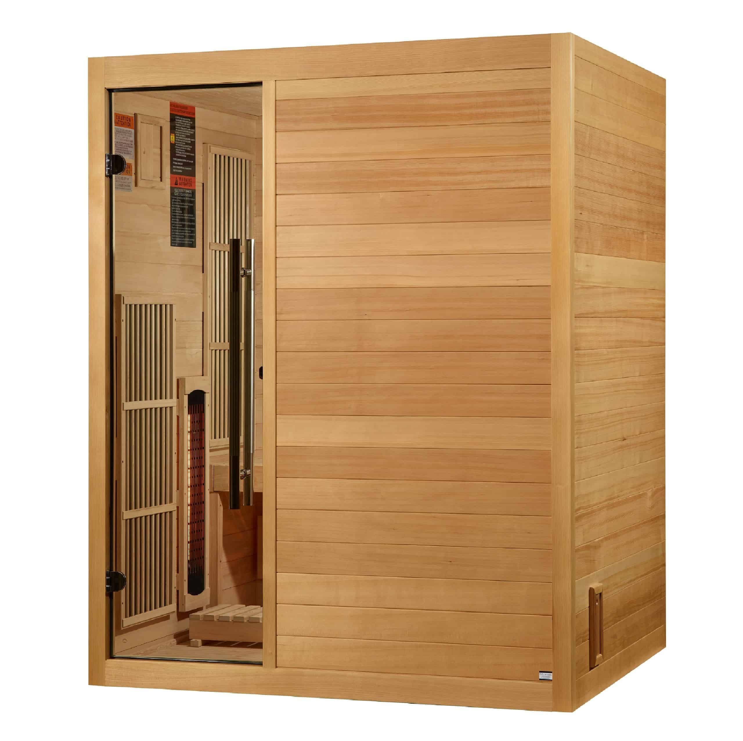 Golden Designs is proud to offer the Soria Indoor Hybrid Sauna featuring our PureTech Full Spectrum Infrared Technology and Harvia Traditional Stove heating options (IR and Stove do not operate at the same time). When the benches are removed, the sauna becomes a yoga/stretching studio. Constructed with the environment in mind, our saunas are made with reforested Canadian Hemlock planks that surpass industry standards, thus producing a quality sauna that retains heat more efficiently, heats up faster and uses less energy in the process.
