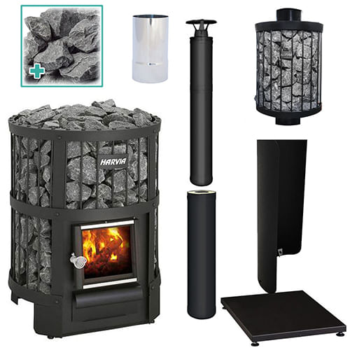 BLK Harvia Legend Package, Legend 150 Stove, Protective Bedding, Protective Sheath, Chimney Kit, Chimney Extension, Stones